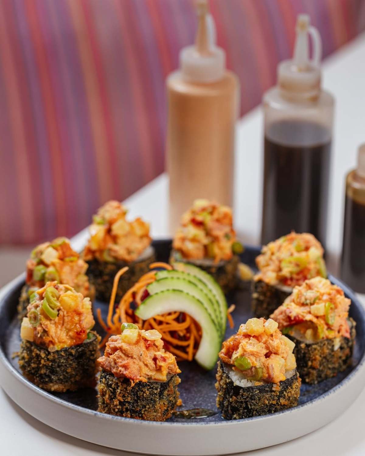 Por otro lado, el SUCHI “Algo Bien” reinventa el concepto de sushi con su relleno de pepino, aguacate y queso crema, cubierto con atún encurtido en limón y marinado en una salsa dulce picante. Acompañado de un aderezo de chipotle, este rollo es una explosión de sabor para quienes buscan un toque especiado y refrescante.